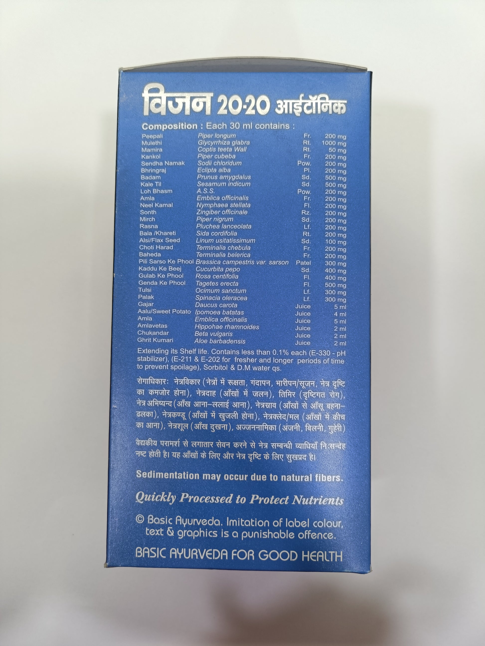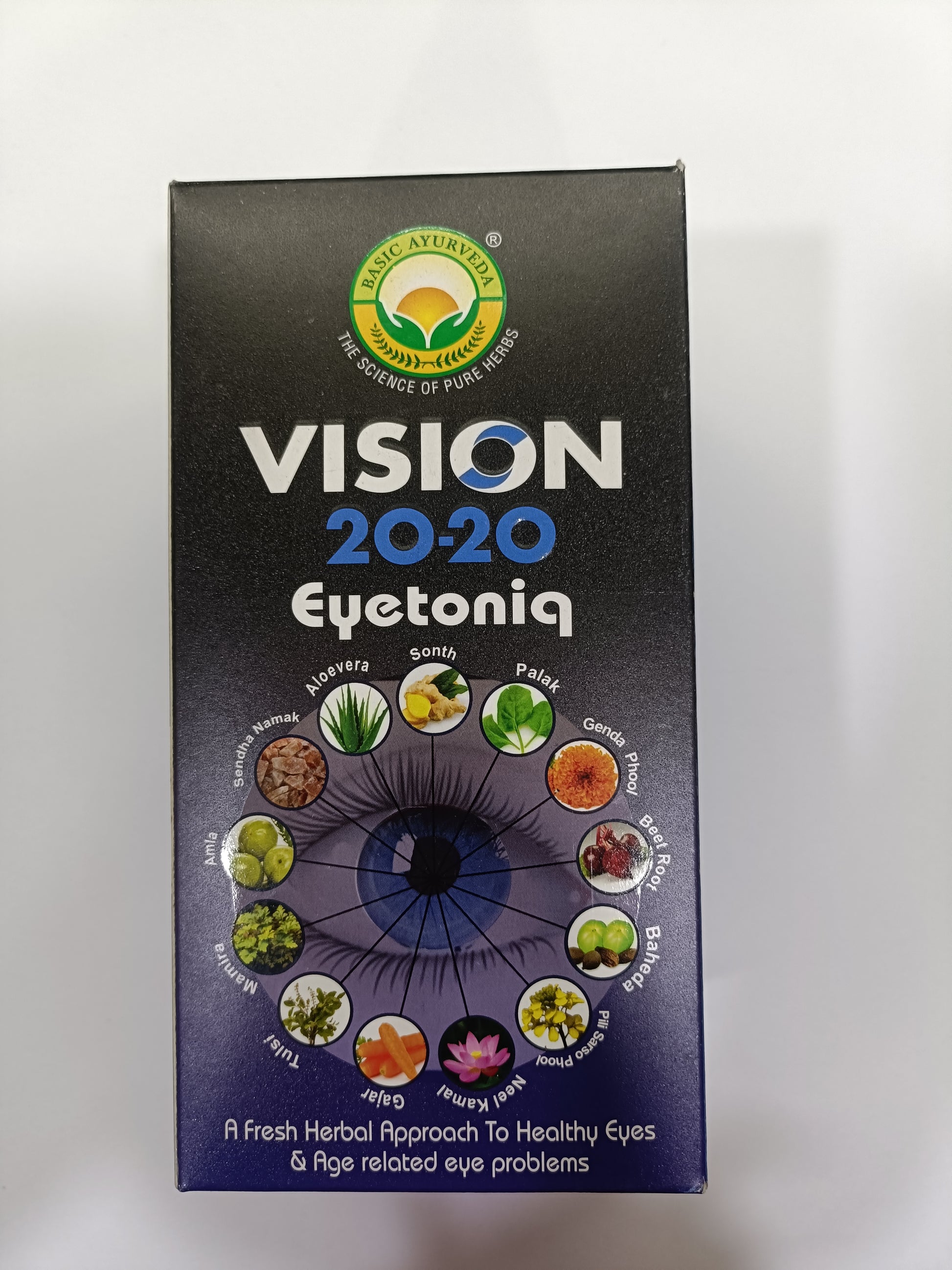 Basic Ayurveda Vision 20-20 Eyetoniq is a natural Ayurvedic formulation that helps maintain healthy eyesight and reduces eye strain. Enriched with herbal extracts, it supports vision clarity, protects from oxidative stress, and promotes overall eye health.